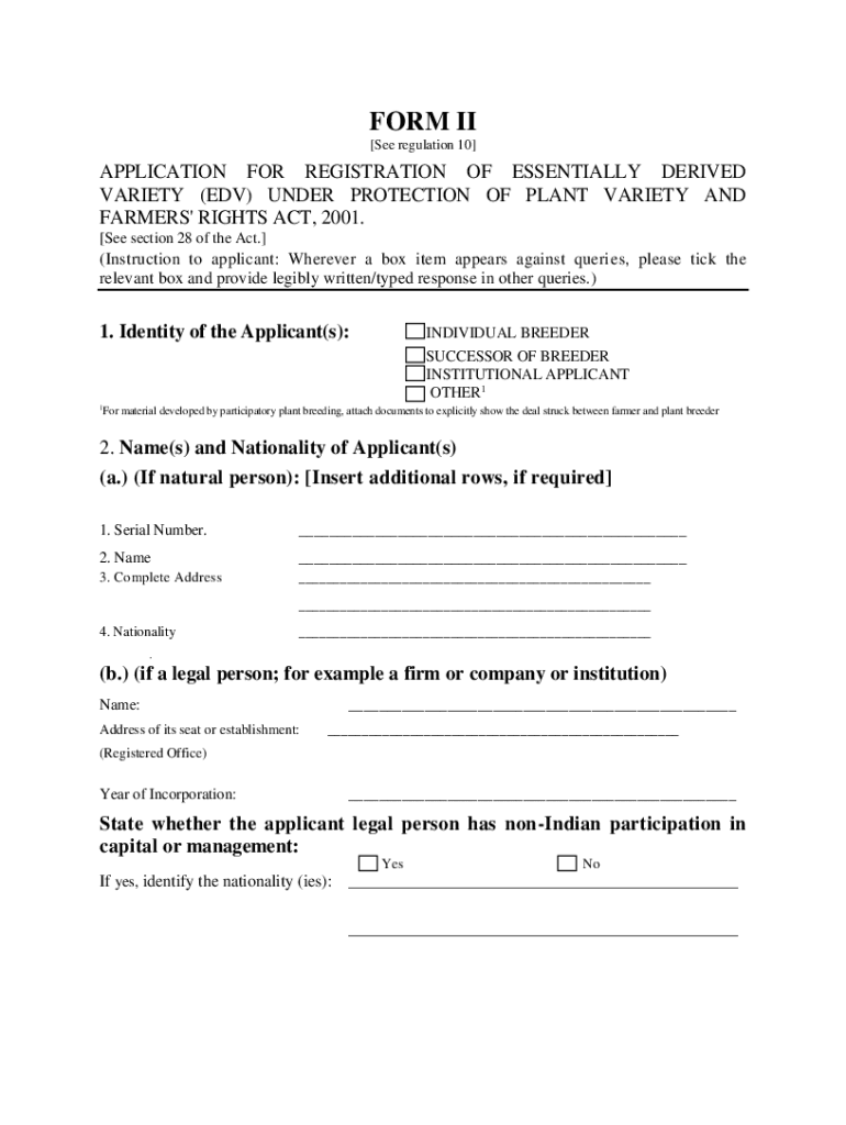 FORM II [See regulation 10]APPLICATION FOR REGISTRATION OF ESSENTIALLY DERIVED VARIETY (EDV) UNDER PROTECTION OF PLANT VARIETY AND FARMERS\' RIGHTS ACT, 2001. [See section 28 of the Act.](Instruction