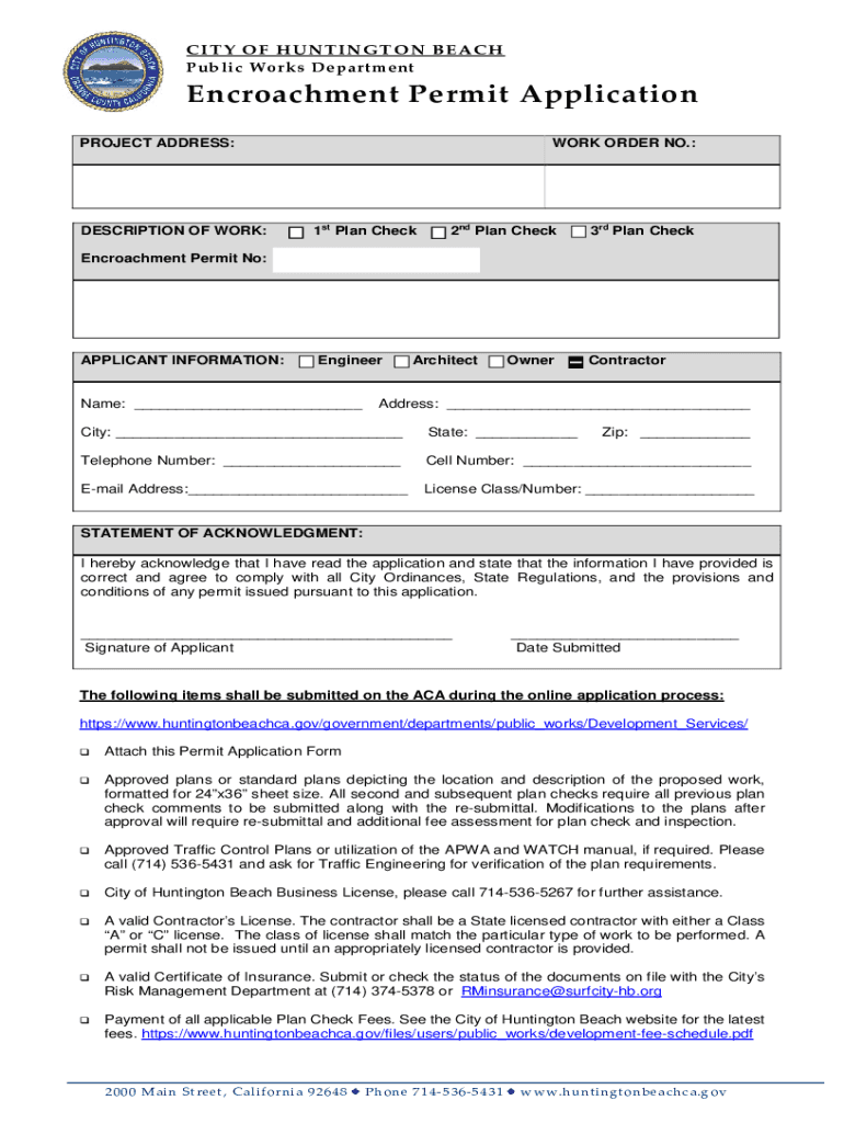 CITY OF HUNTINGTON BEACH Public Works DepartmentEncroachment Permit Application PROJECT ADDRESS:DESCRIPTION OF WORK:WORK ORDER NO.:1st Plan Check2nd Plan Check3rd Plan CheckEncroachment Permit No:APPLICANT
