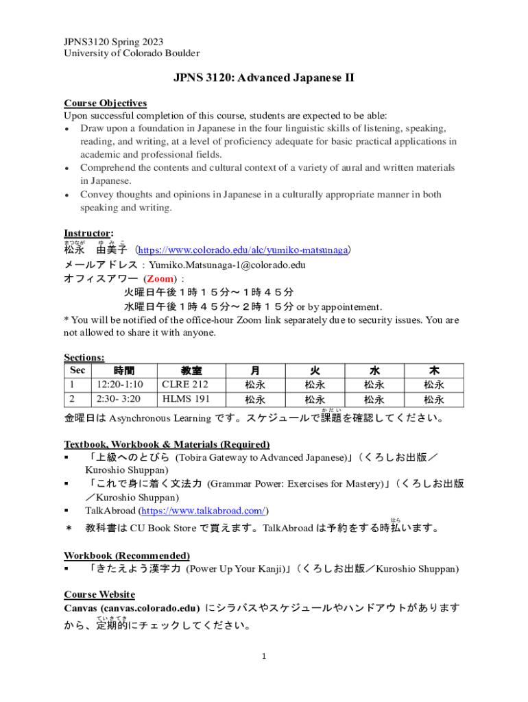 JPNS3120 Spring 2023 University of Colorado Boulders 3120: Advanced Japanese II Course Objectives Upon successful completion of this course, students are expected to be able: Draw upon a foundation