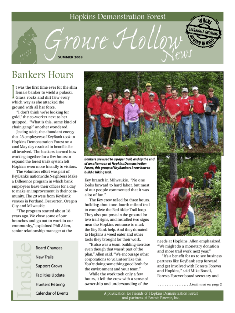Hopkins Demonstration ForestGrouse Hollow News SUMMER 2008Bankers HoursIInsidet was the first time ever for the slim female banker to wield a pulaski. Grass, rocks and dirt flew every which way as