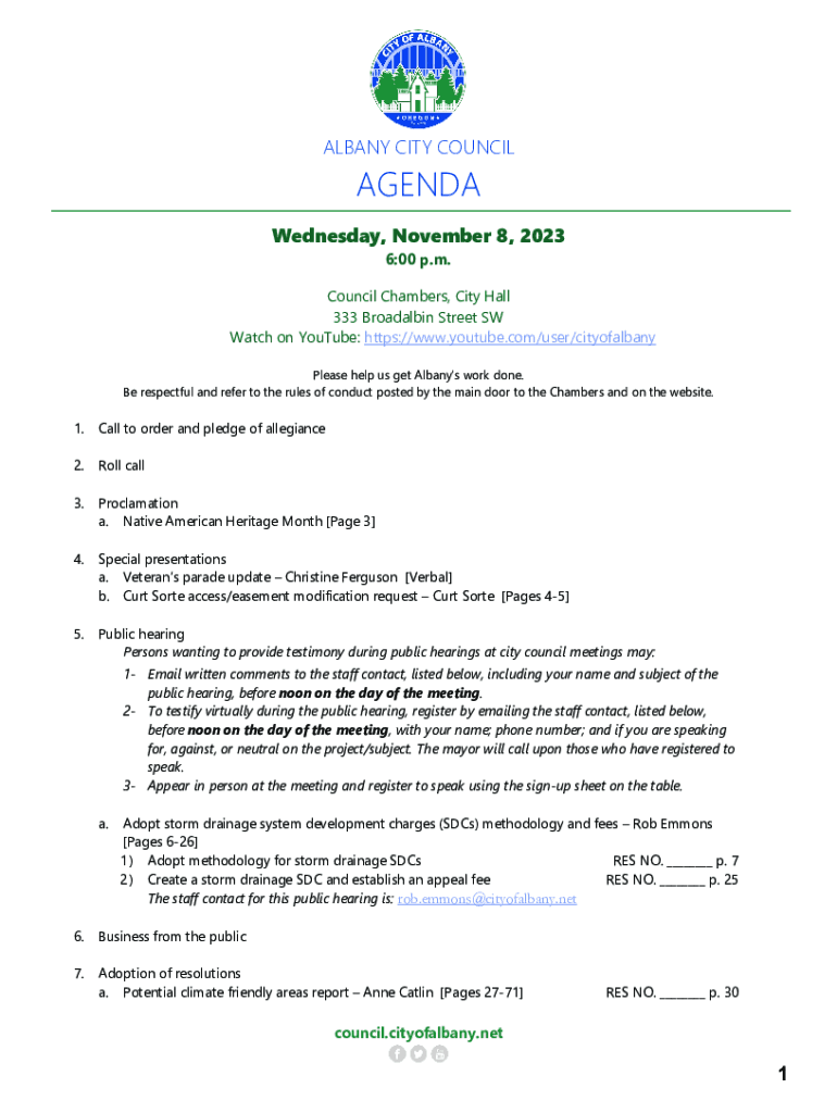 ALBANY CITY COUNCILAGENDAWednesday, November 8, 2023 6:00 p.m. Council Chambers, City Hall 333 Broadalbin Street SW Watch on YouTube: https://www.youtube.com/user/cityofalbany Please help us get Albany's