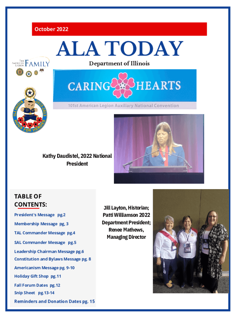 October 2022ALA TODAY Department of IllinoisKathy Daudistel, 2022 NationalPresidentTABLE OFCONTENTS: President\'s Message pg.2 Membership Message pg, 3TAL Commander Message pg.4 SAL Commander Message