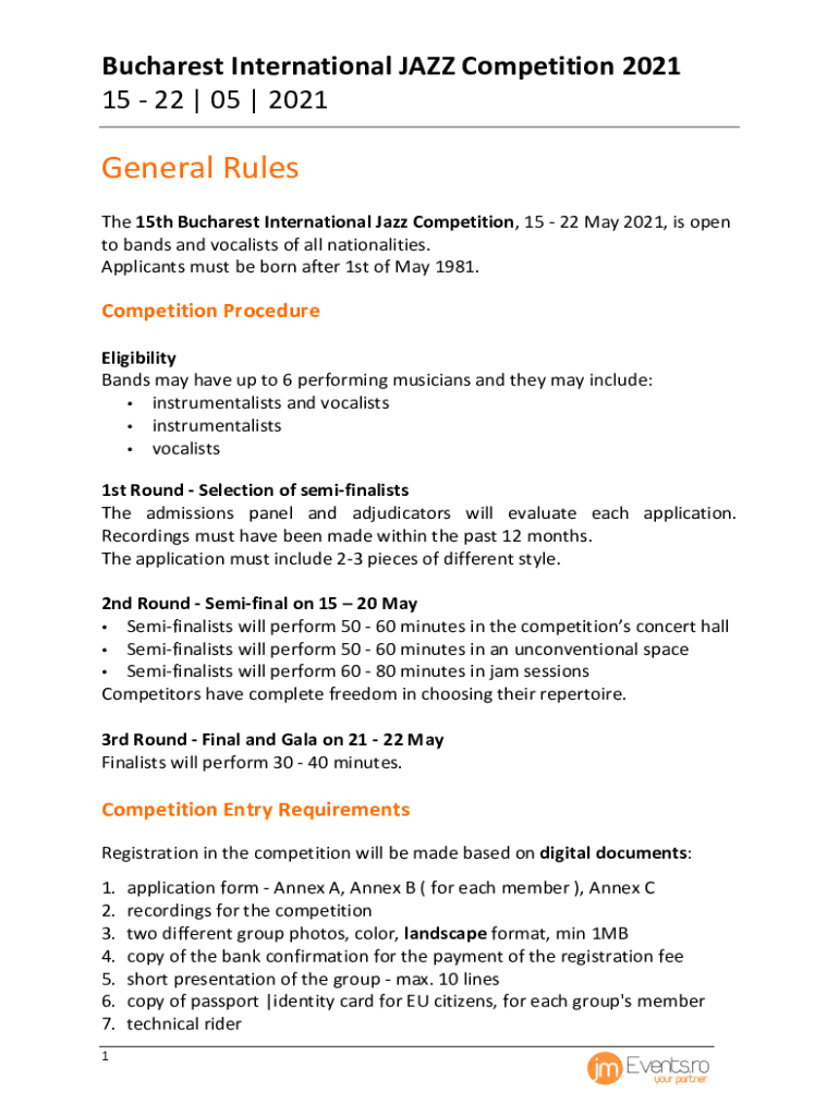 BucharestInternationalJAZZCompetition2021 1522|05|2021GeneralRules The15thBucharestInternationalJazzCompetition,1522May2021,isopen tobandsandvocalistsofallnationalities. Applicantsmustbebornafter1stofMay1981.CompetitionProcedure
