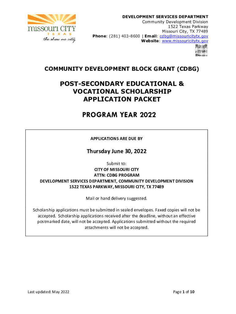 DEVELOPMENT SERVICES DEPARTMENT Community Development Division 1522 Texas Parkway Missouri City, TX 77489 Phone: (281) 4038600 | Email: cdbg@missouricitytx.gov Website: www.missouricitytx.govCOMMUNITY