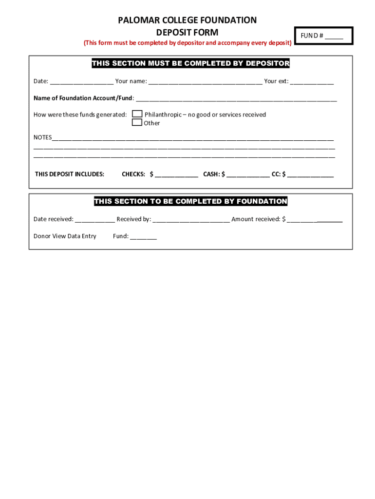 PALOMAR COLLEGE FOUNDATION DEPOSIT FORM (This form must be completed by depositor and accompany every deposit)FUND # ___THIS SECTION MUST BE COMPLETED BY DEPOSITOR Date: ___ Your name: ___ Your ext: