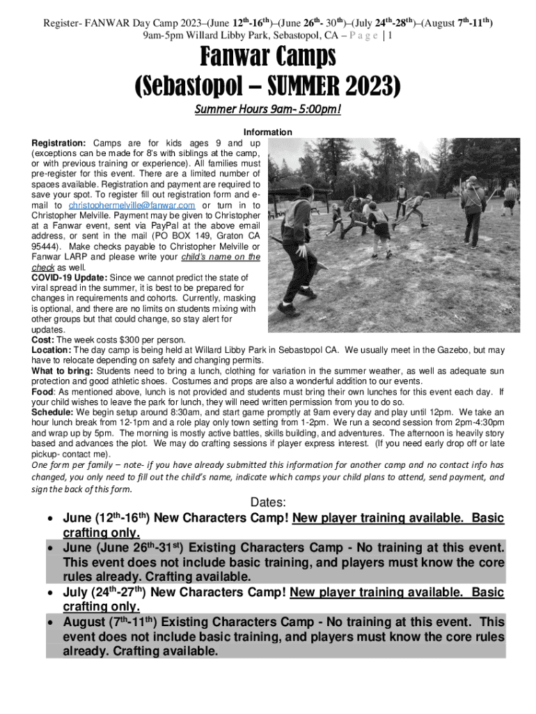 Register ANWAR Day Camp 2023(June 12th16th)(June 26th 30th)(July 24th28th)(August 7th11th) 9am5pm Willard Libby Park, Sevastopol, CA P a g e | 1Fanwar Camps (Sevastopol SUMMER 2023) Summer Hours 9am