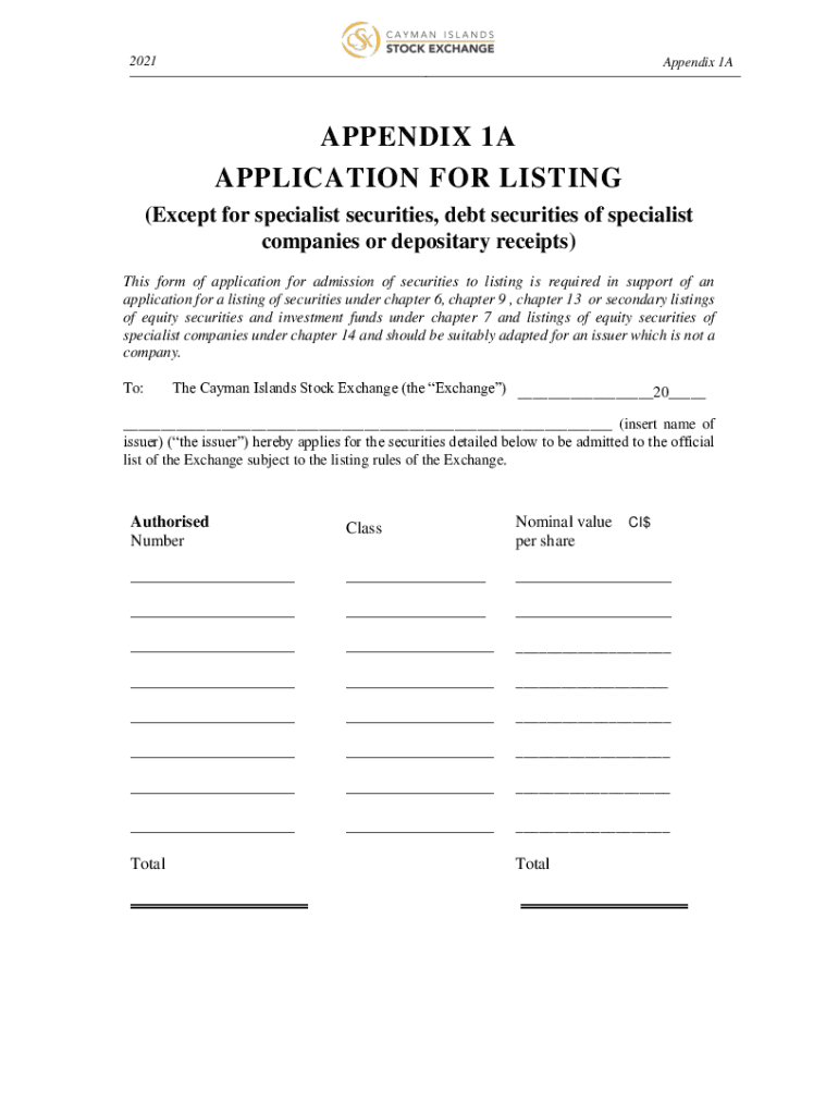2021Appendix 1AAPPENDIX 1A APPLICATION FOR LISTING (Except for specialist securities, debt securities of specialist companies or depository receipts) This form of application for admission of securities