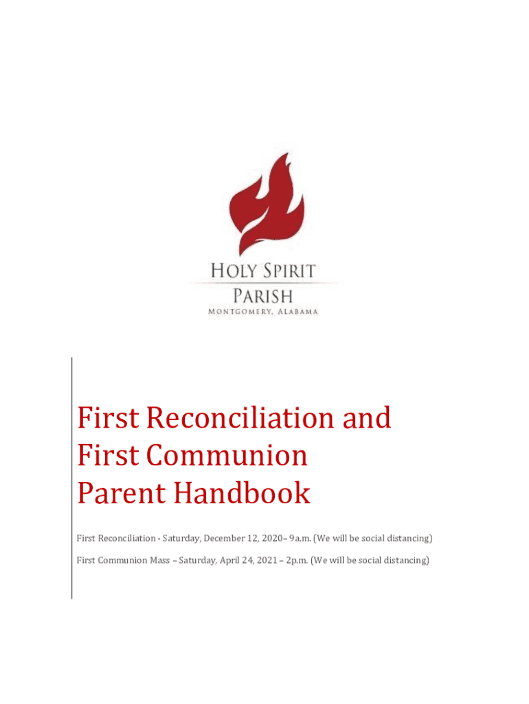 First Reconciliation and First Communion Parent Handbook First Reconciliation Saturday, December 12, 2020 9a.m. (We will be social distancing) First Communion Mass Saturday, April 24, 2021 2p.m. (We