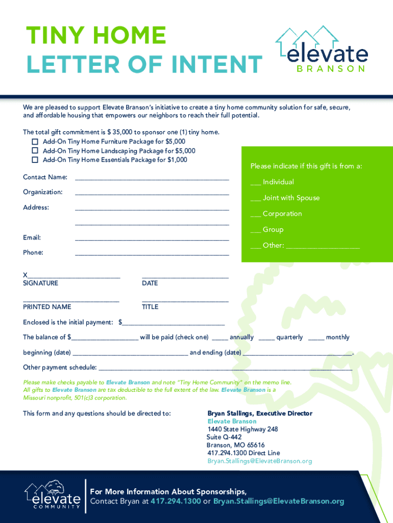 TINY HOME LETTER OF INTENT We are pleased to support Elevate Bransons initiative to create a tiny home community solution for safe, secure, and affordable housing that empowers our neighbors to reach