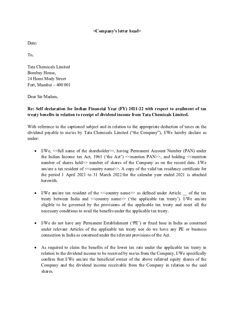 Companies letter head Date: To, Tata Chemicals Limited Bombay House, 24 Home Body Street Fort, Mumbai 400 001 Dear Sir/Madam, Re: Self declaration for Indian Financial Year (FY) 202122 with respect