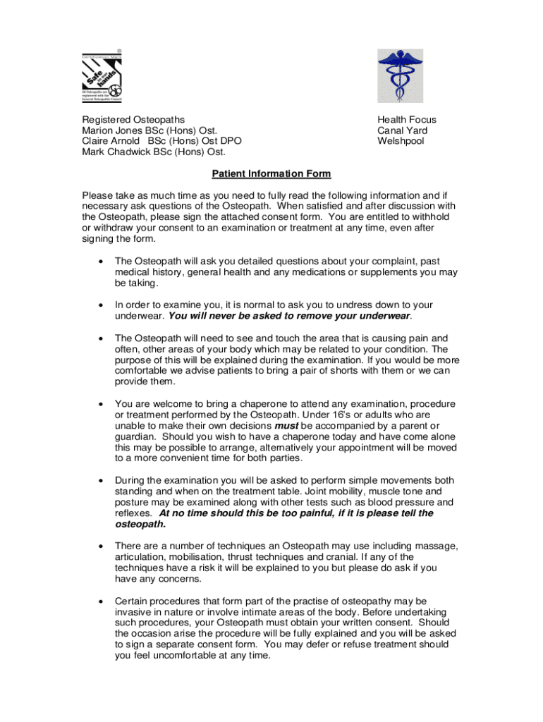 Registered Osteopaths Marion Jones B.Sc. (Hons) OST. Claire Arnold B.Sc. (Hons) OST DPO Mark Chadwick B.Sc. (Hons) OST. Health Focus Canal Yard WelshpoolPatient Information Form Please take as much