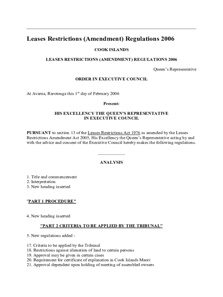 Leases Restrictions (Amendment) Regulations 2006 COOK ISLANDS LEASES RESTRICTIONS (AMENDMENT) REGULATIONS 2006 Queens Representative ORDER IN EXECUTIVE COUNCIL At Avarua, Rarotonga this 1st day of