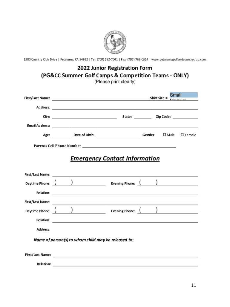 1500 Country Club Drive | Petaluma, CA 94952 | Tel: (707) 7627041 | Fax: (707) 7620314 | www.petalumagolfandcountryclub.com2022 Junior Registration Form (PG&CC Summer Golf Camps & Competition Teams