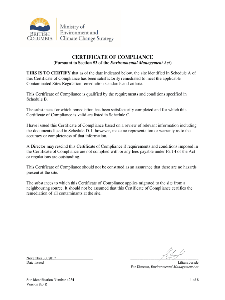 CERTIFICATE OF COMPLIANCE (Pursuant to Section 53 of the Environmental Management Act) THIS IS TO CERTIFY that as of the date indicated below, the site identified in Schedule A of this Certificate