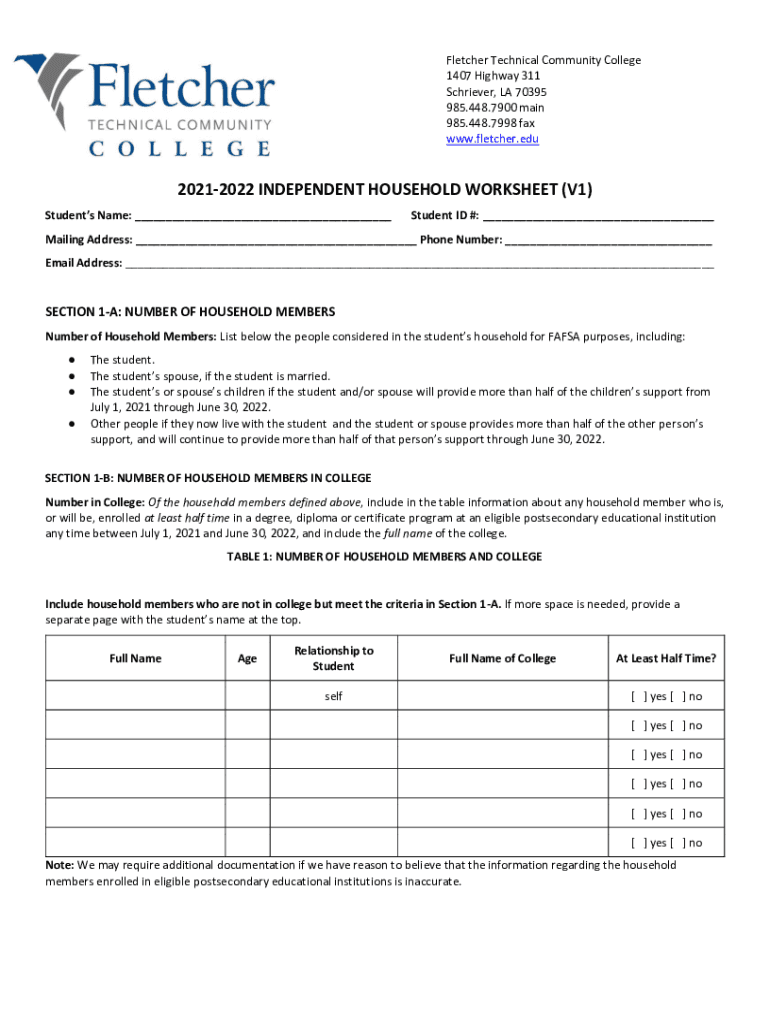 Fletcher Technical Community College 1407 Highway 311 Schroeder, LA 70395 985.448.7900 main 985.448.7998 fax www.fletcher.edu20212022 INDEPENDENT HOUSEHOLD WORKSHEET (V1) Students Name: ___Student