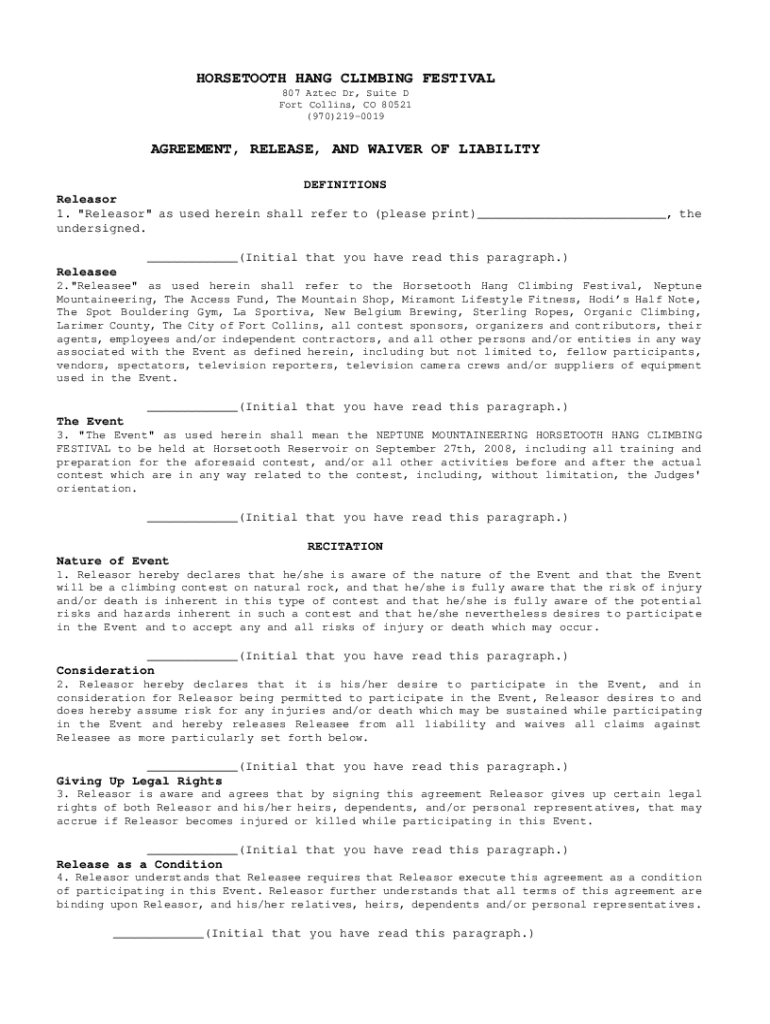 HORSETOOTH HANG CLIMBING FESTIVAL 807 Aztec Dr, Suite D Fort Collins, CO 80521 (970)2190019AGREEMENT, RELEASE, AND WAIVER OF LIABILITY DEFINITIONS Releasor 1. \"Releasor\" as used herein shall refer