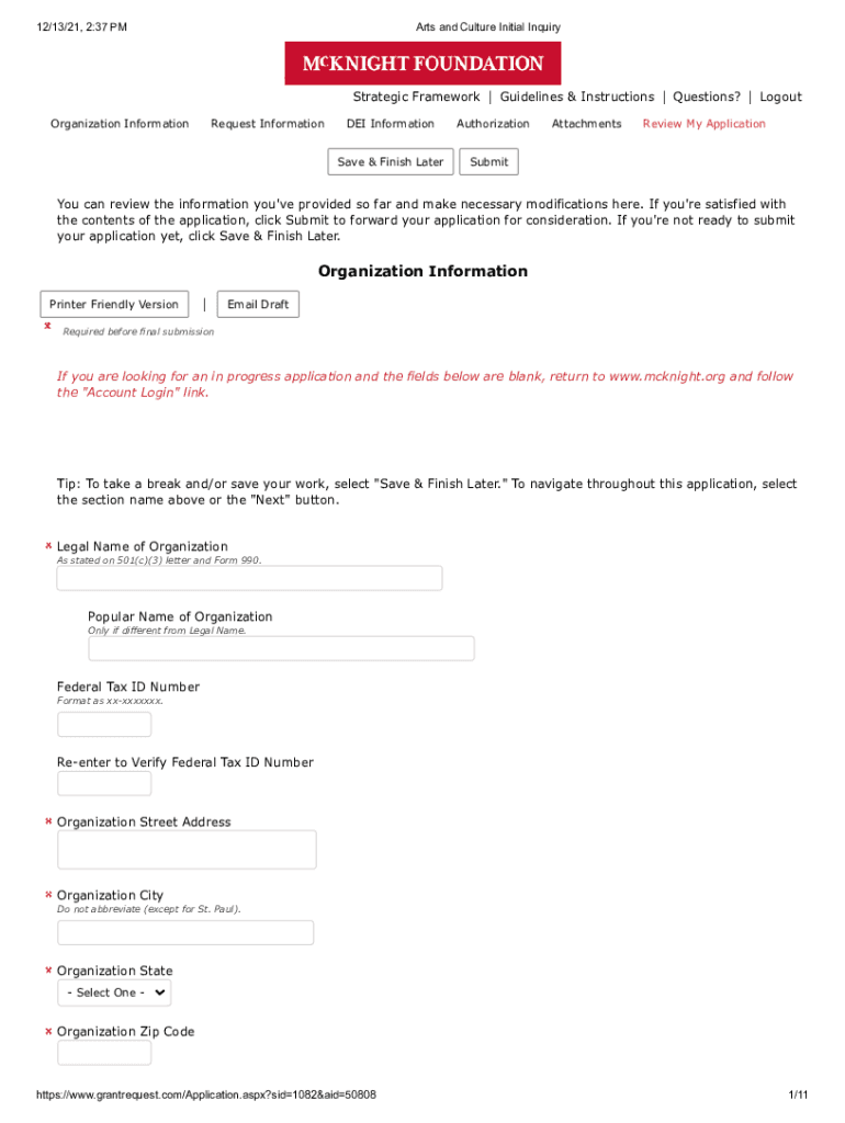 12/13/21, 2:37 Parts and Culture Initial InquiryStrategic Framework | Guidelines & Instructions | Questions? | Logout Organization InformationRequest Information DEI Information Save & Finish LaterAuthorizationAttachmentsReview