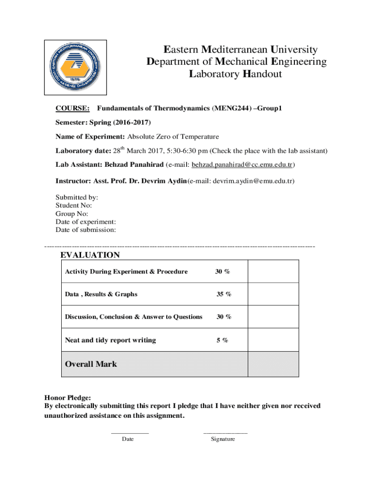 Eastern Mediterranean University Department of Mechanical Engineering Laboratory Handout COURSE: Fundamentals of Thermodynamics (MENG244) Group1 Semester: Spring (20162017) Name of Experiment: Absolute