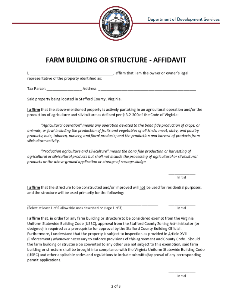 FARM BUILDING OR STRUCTURE EXEMPTION Per 3699 of the Code of Virginia, farm buildings or structures can be considered exempt from requirements of the Virginia Uniform Statewide Building Code (USB).