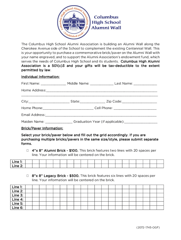 The Columbus High School Alumni Association is building an Alumni Wall along the Cherokee Avenue side of the School to complement the existing Centennial Wall. This is your opportunity to purchase