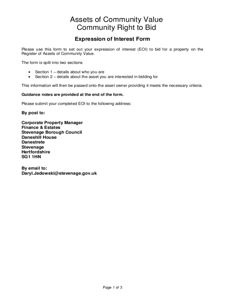 Assets of Community Value Community Right to Bid Expression of Interest Form Please use this form to set out your expression of interest (EOI) to bid for a property on the Register of Assets of Community