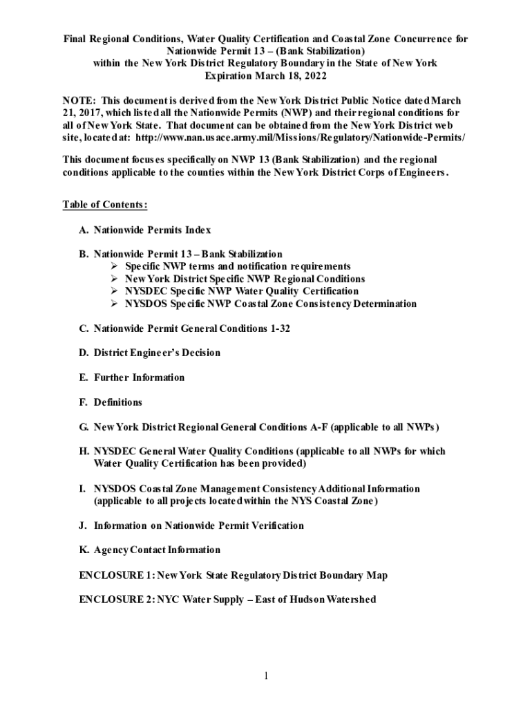 Final Regional Conditions, Water Quality Certification and Coastal Zone Concurrence for Nationwide Permit 13 (Bank Stabilization) within the New York District Regulatory Boundary in the State of New