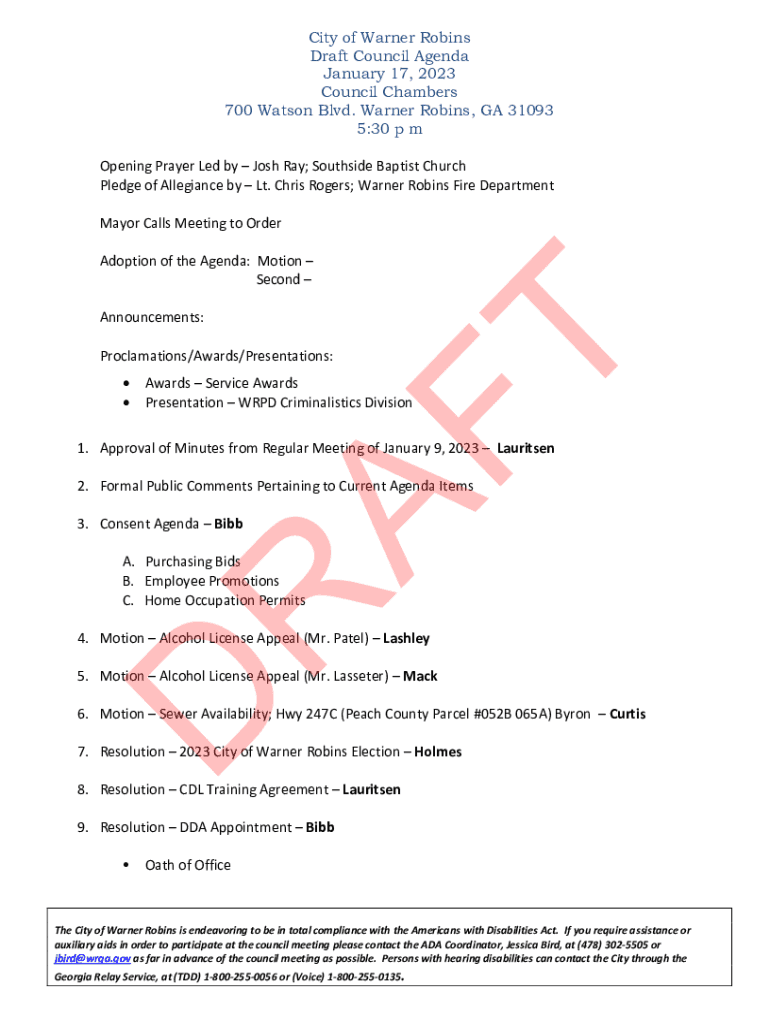 Get the free City of Warner Robins Draft Council Agenda January 17, ...
