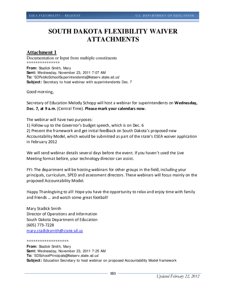 ESEA FLEXIBILITY REQUESTU.S. DEPARTMENT OF EDUCATIONSOUTH DAKOTA FLEXIBILITY WAIVER ATTACHMENTS Attachment 1 Documentation or Input from multiple constituents *************** From: Stadick Smith,