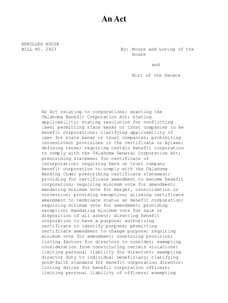 An Act ENROLLED HOUSE BILL NO. 2423By: Moore and Loring of the House and Kirt of the SenateAn Act relating to corporations; enacting the Oklahoma Benefit Corporation Act; stating applicability; stating