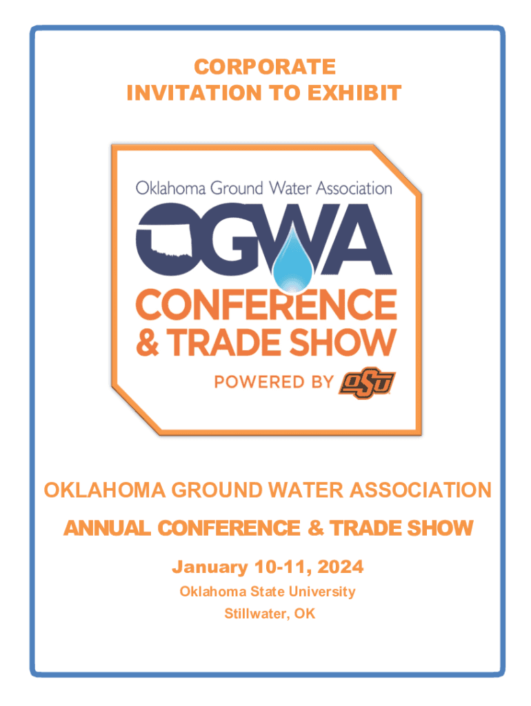 CORPORATE INVITATION TO EXHIBITOKLAHOMA GROUND WATER ASSOCIATION ANNUAL CONFERENCE & TRADE SHOW January 1011, 2024 Oklahoma State University Stillwater, OKTHE CONFERENCE The 2024 Oklahoma Ground Water