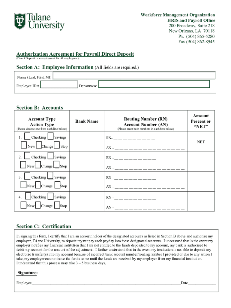 Workforce Management Organization HRIS and Payroll Office 200 Broadway, Suite 218 New Orleans, LA 70118 Ph. (504) 8655280 Fax (504) 8628945Authorization Agreement for Payroll Direct Deposit (Direct