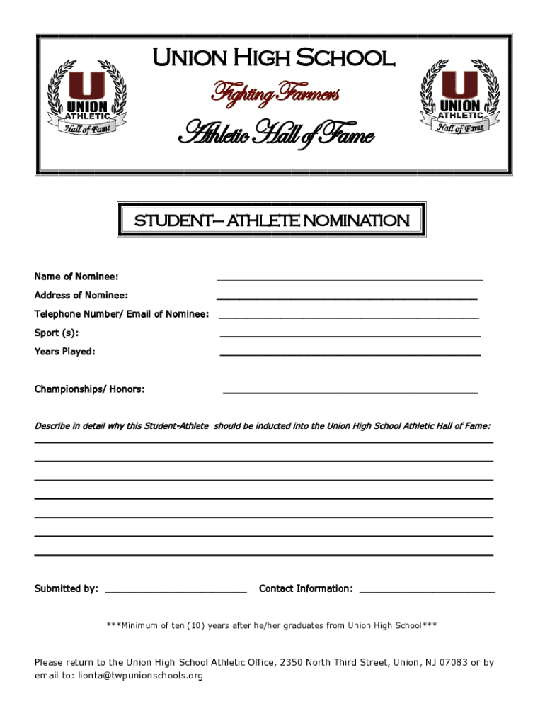 Union High SchoolFighting FarmersAthletic Hall of Fame STUDENT ATHLETE NOMINATIONName of Nominee:___Address of Nominee:___Telephone Number/ Email of Nominee:___Sport (s):___Years Played:___Championships/