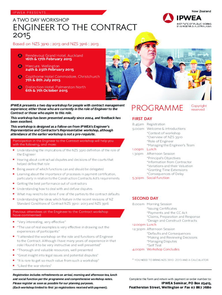 IPWEA PRESENTS...A TWO DAY WORKSHOPENGINEER TO THE CONTRACT 2015 Based on NZS 3910 : 2013 and NZS 3916 : 2013 Rendevouz Grand Hotel, Auckland 16th & 17th February 2015 Mercure, Wellington 24th & 25th
