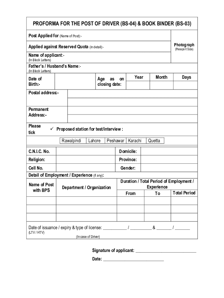 PROFORMA FOR THE POST OF DRIVER (BS04) & BOOK BINDER (BS03)