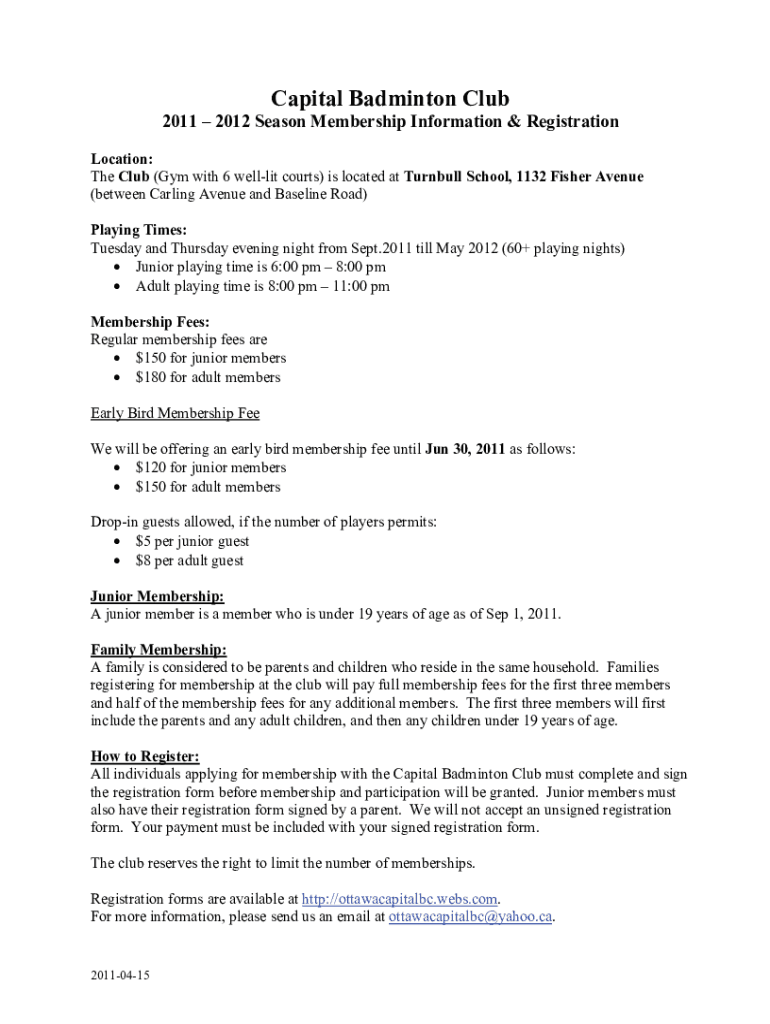 Capital Badminton Club 2011 2012 Season Membership Information & Registration Location: The Club (Gym with 6 well lit courts) is located at Turnbull School, 1132 Fisher Avenue (between Calling Avenue