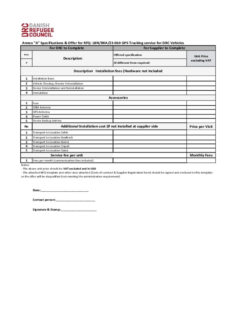 Get the free Annex "A" Specifications & Offer for RFQ: LBN/BKA/23-069 GPS Tracking service for DR...