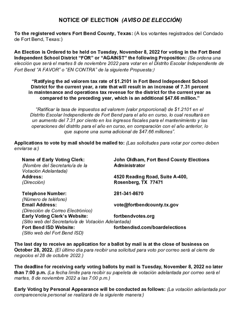 To the registered voters Fort Bend County, Texas: (A Los rotates registrants Del Condado