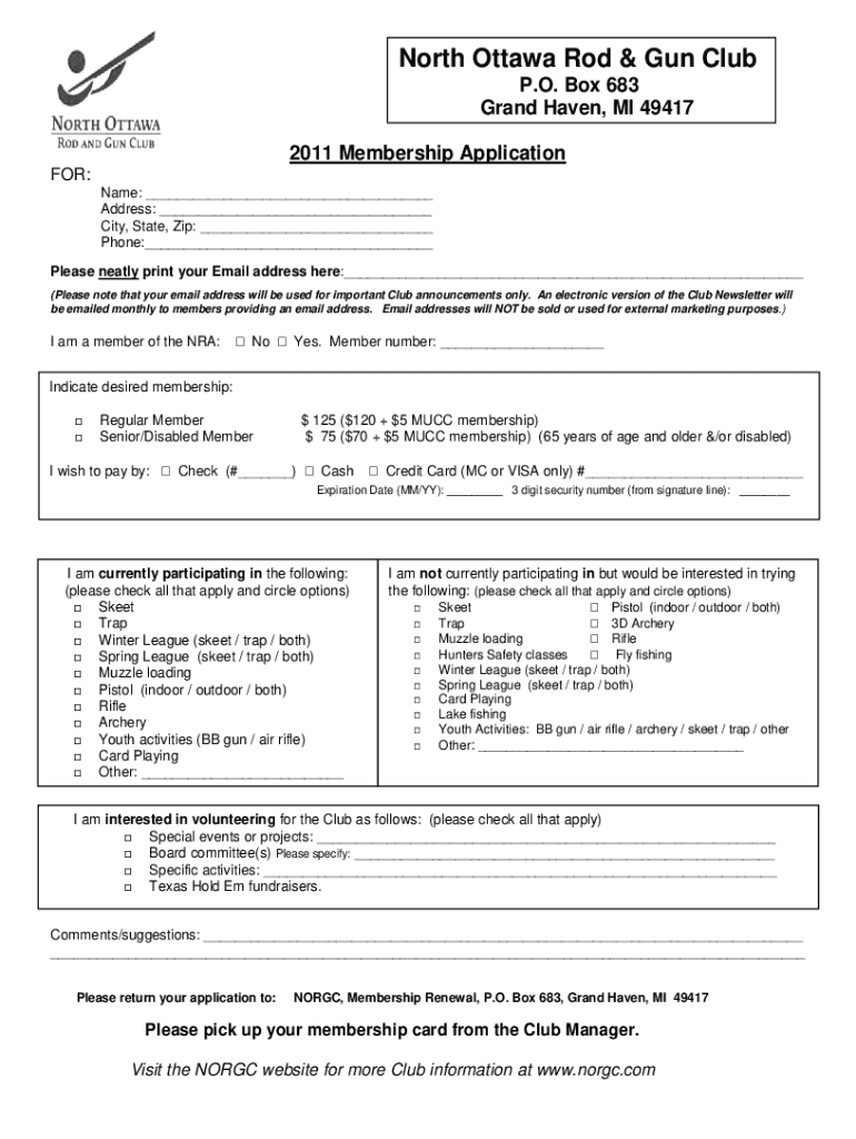 North Ottawa Rod & Gun Club P.O. Box 683 Grand Haven, MI 49417 2011 Membership Application FOR: Name: ___ Address: ___ City, State, Zip: ___ Phone:___ Please neatly print your Email address here:___