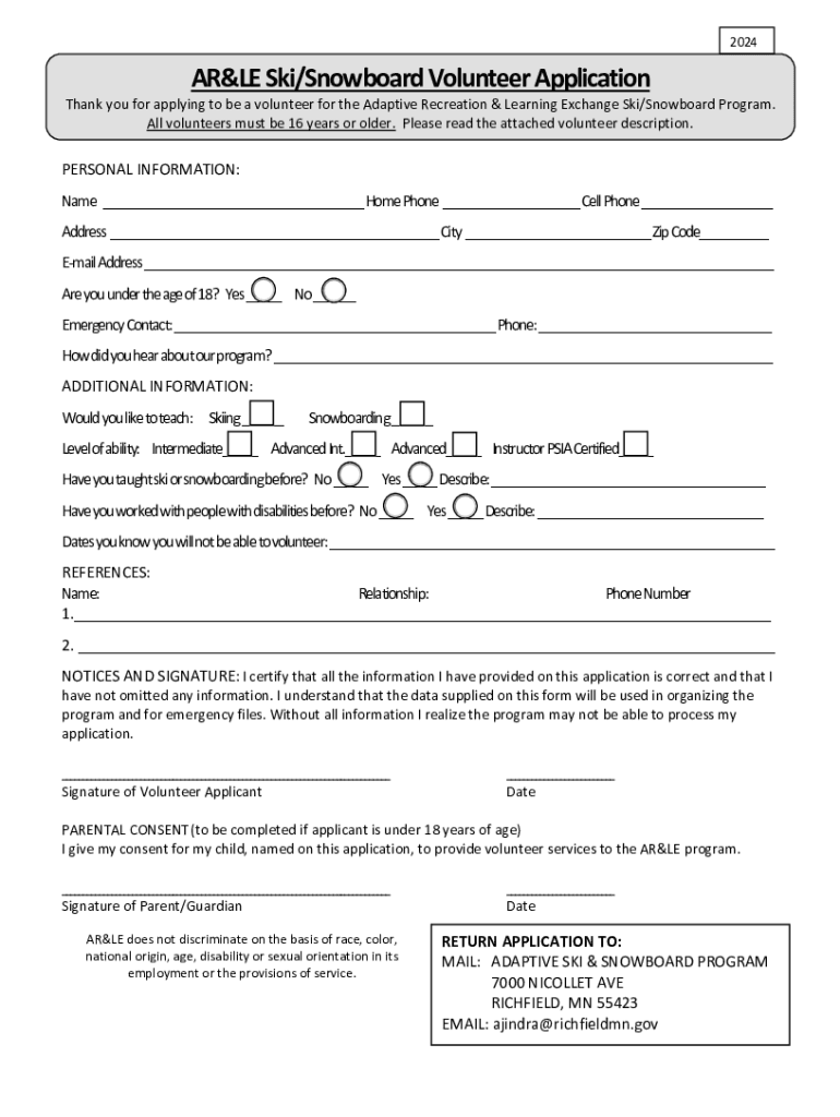 Dear Volunteer, Thank you for your interest in the Adaptive Recreation & Learning Exchange (AR&LE) Ski and Snowboard Program. AR&LE is a cooperative between the cities of Bloomington, Eden Prairie,