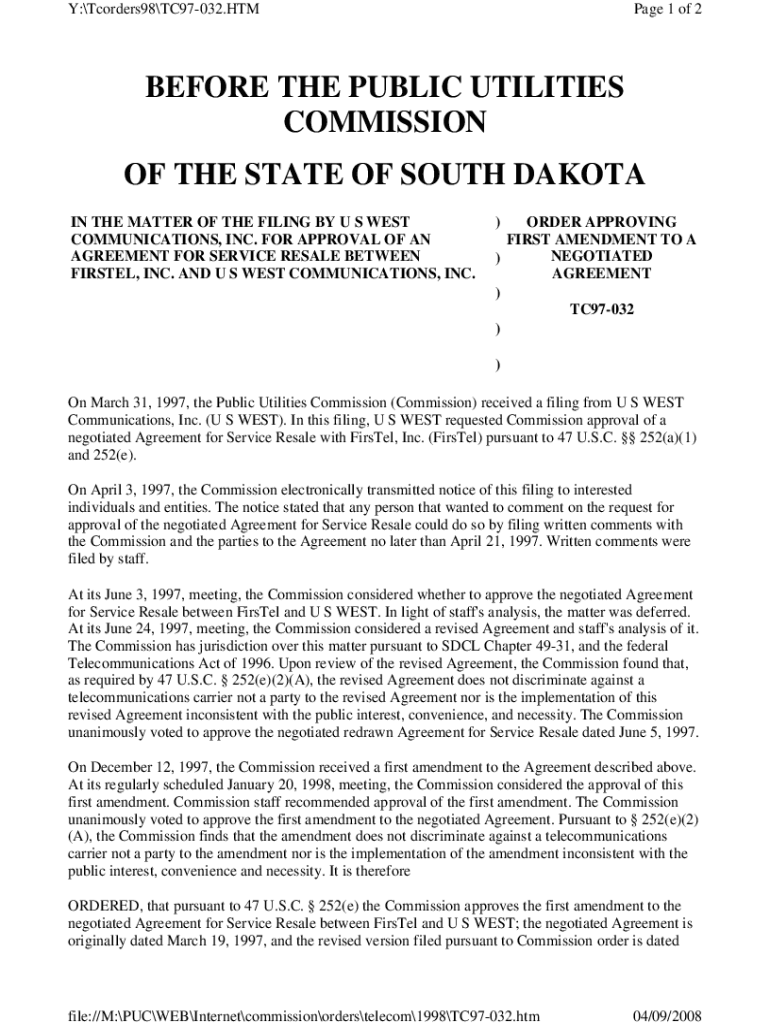 Y:Tcorders98TC97032.Homage 1 of 2BEFORE THE PUBLIC UTILITIES COMMISSION OF THE STATE OF SOUTH DAKOTA IN THE MATTER OF THE FILING BY U S WEST COMMUNICATIONS, INC. FOR APPROVAL OF AN AGREEMENT FOR SERVICE
