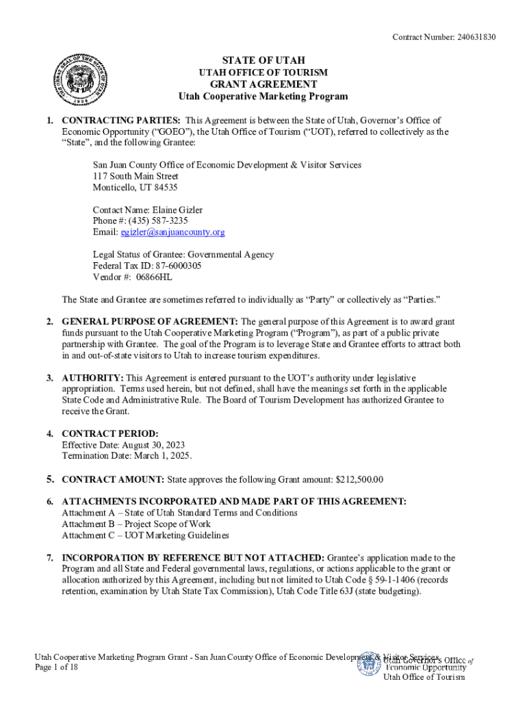 Contract Number: 240631830STATE OF UTAHAN OFFICE OF TOURISMGRANT AGREEMENT