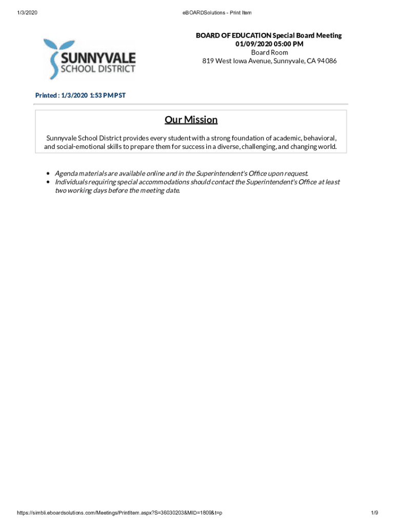 1/3/2020eBOARDSolutions Print Teaboard OF EDUCATION Special Board Meeting 01/09/2020 05:00 PM Board Room 819 West Iowa Avenue, Sunnyvale, CA 94086Printed : 1/3/2020 1:53 PM Tour Mission Sunnyvale