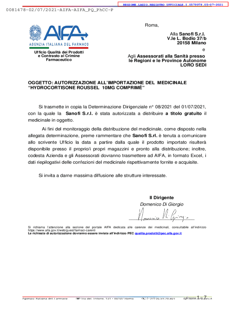REGION.RADIO.REGISTRY OFFICIAL. I.0579979.05072021008147802/07/2021AIFAAIFA_PQ_PhCCPRoma,Ufficio Quality DEI Product