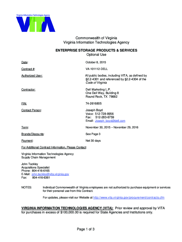 Date:October 8, 2015Contract #:VA101112DELLAuthorized User:All public bodies, including