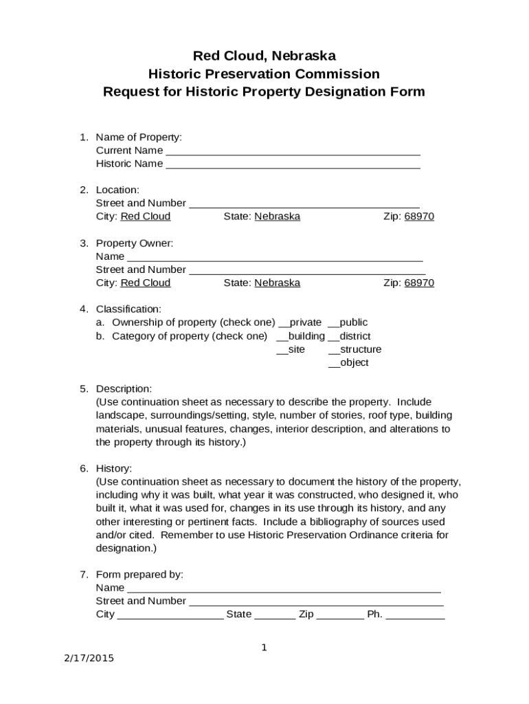 The Request for Historic Property Designation is a Word document that should be submitted to the specific address to provide specific info. It has to be filled-out and signed, which is possible in hard copy, or by using a particular software e. g. PDFfiller. This tool allows to fill out any PDF or Word document right in the web, customize it depending on your needs and put a legally-binding e-signature. Right away after completion, you can send the Request for Historic Property Designation to the relevant individual, or multiple ones via email or fax. The blank is printable too from PDFfiller feature and options offered for printing out adjustment. Both in digital and in hard copy, your form should have a neat and professional appearance. It's also possible to turn it into a template to use later, so you don't need to create a new blank form from scratch. You need just to customize the ready form.