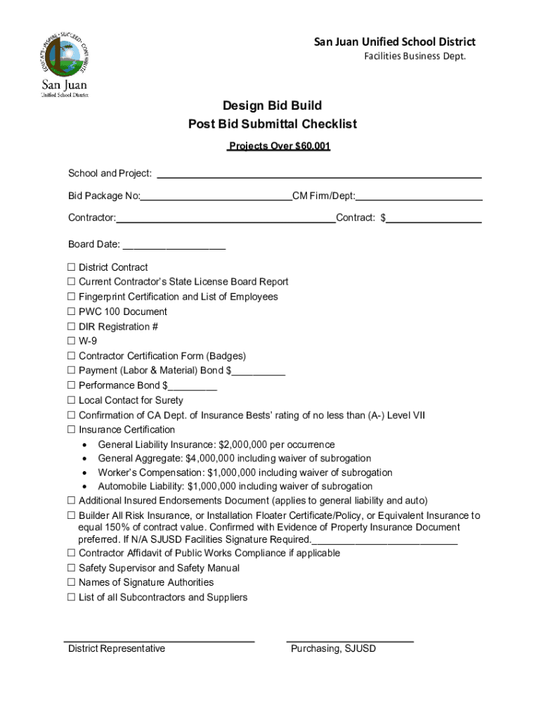 San Juan Unified School District Facilities Business Dept. Design Bid Build Post Bid Submittal Checklist Projects Over $60,001 School and Project: Bid Package No: Contractor:CM Firm/Dept: Contract: