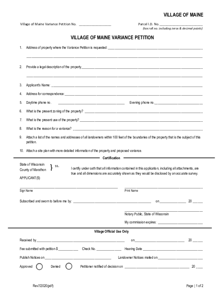 VILLAGE OF MAINE Village of Maine Variance Petition No. ___Parcel I.D. No. ___ (tax roll no. including zeros & decimal points)VILLAGE OF MAINE VARIANCE PETITION 1.Address of property where the Variance