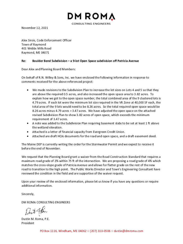 Re:Boulder Bend Subdivision a 9lot Open Space subdivision off Patricia AvenueDear Alex