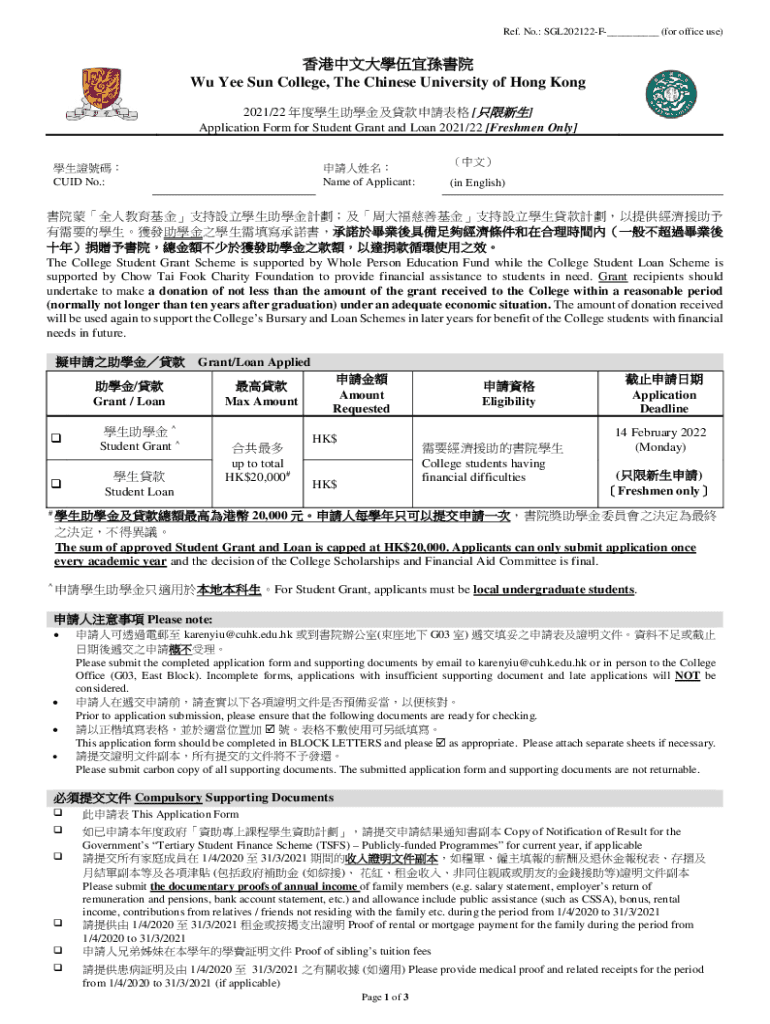 Ref. No.: SGL202122F___ (for office use) Wu Yes Sun College, The Chinese University of Hong Kong 2021/22 [] Application Form for Student Grant and Loan 2021/22 [Freshmen Only] QUID No.: Name of Applicant: