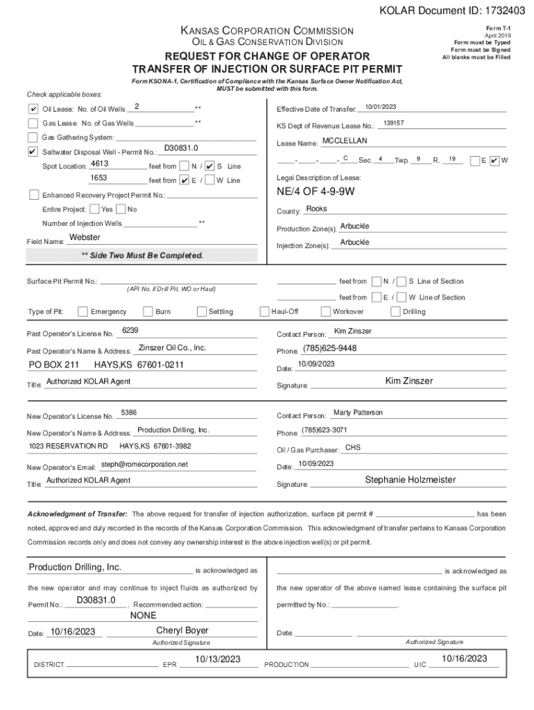 KOLAR Document ID: 1732403K ANSAS CORPORATION COMMISSIONForm T1 April 2019 Form must be Typed Form must be Signed All blanks must be FilledOIL & GAS CONSERVATION DIVISION REQUEST FOR CHANGE OF OPERATOR